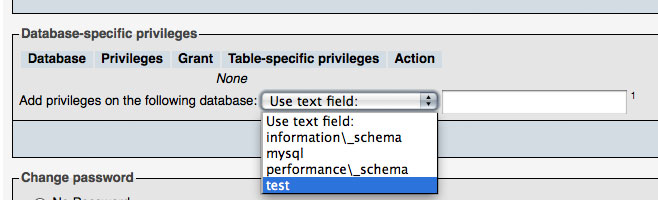 On the next page, skip down to the "Database-specific Privileges" and choose your new database using the dropdown menu: