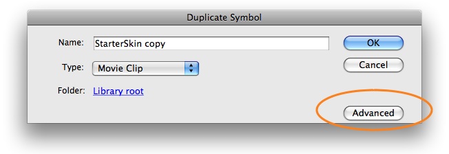 The StarterSkin movieclip is the base template for each of the skin(s) you create.    It will never be used directly; instead, it will be duplicated for each skin you want to create.    To start creating a new symbol, you will Cmd+click (right click) on the StarterSkin clip and select 'Duplicate':