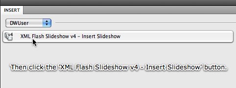 The Insert Slideshow wizard can also be accessed from the Insert Menu, which is the menu at the top of your screen next to File, Edit and View.    It is accessed by selecting Insert > DWUser > XML Flash Slideshow v4.