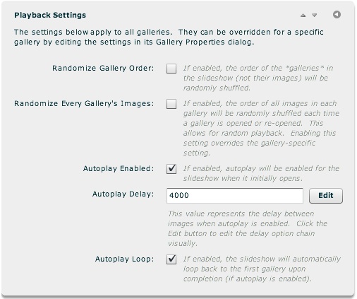 Autoplay Delay When autoplay is enabled, this value specifies the default delay between each image/slide.  These values are specially constructed strings; clicking the Edit button allows you to visually edit the value.    To learn more, see Using the Autoplay Delay Editor.    This can be overridden for individual galleries or individual images.