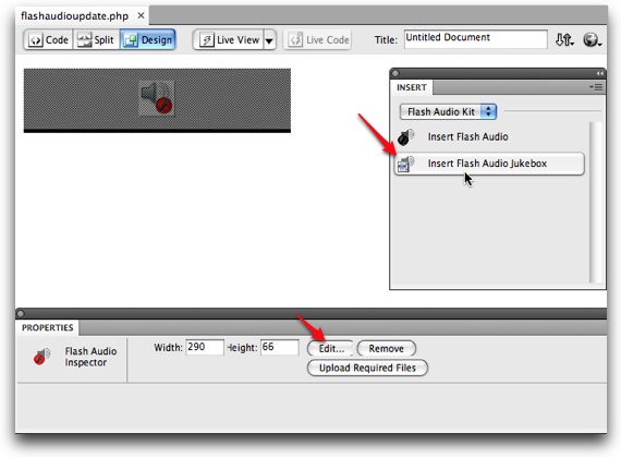 The extension is accessed via the Flash Audio Kit section of the Insert Panel (Window > Insert). Click the Insert Flash Audio button to launch the extension dialog. Shown here are both newer (CS4+) and older versions of Dreamweaver: